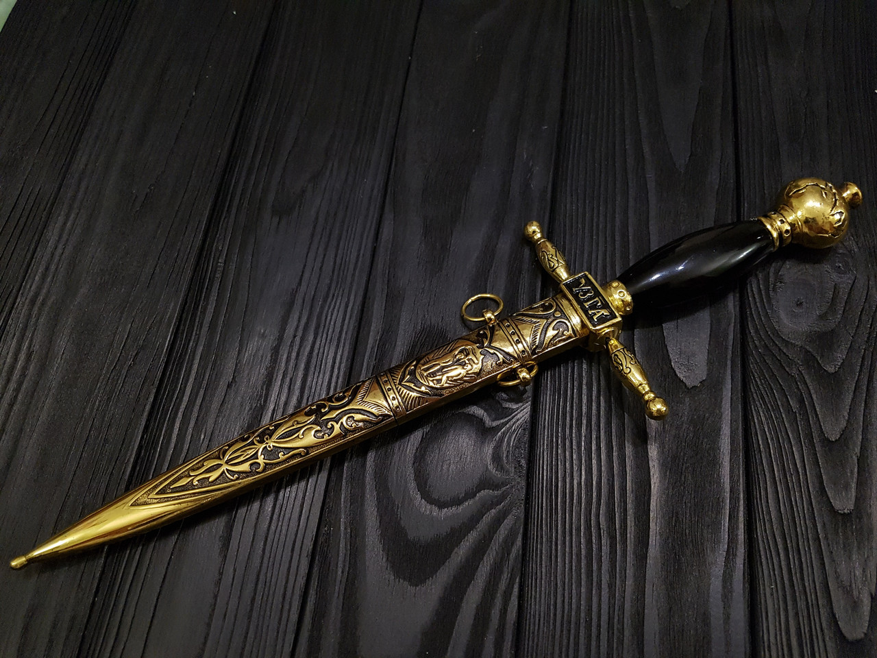 Сувенірний кортик 9151 виготовлений з нержавіючої сталі і металевого відливу. В цілому, виріб характеризується чіткістю і красою виконання Відливи стилізовані під постарене золото.